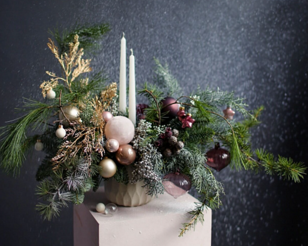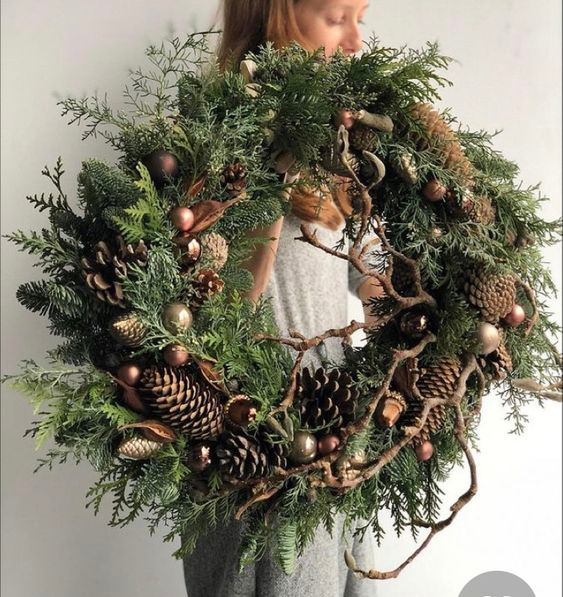 Наполнение: сухоцветы, искусственные ветки ели (которые прослужат ни один сезон), живые ветки, кисти из бахромы, шары бархатные/матовые /глянцевые, сосульки, гирлянда теплого света, декор